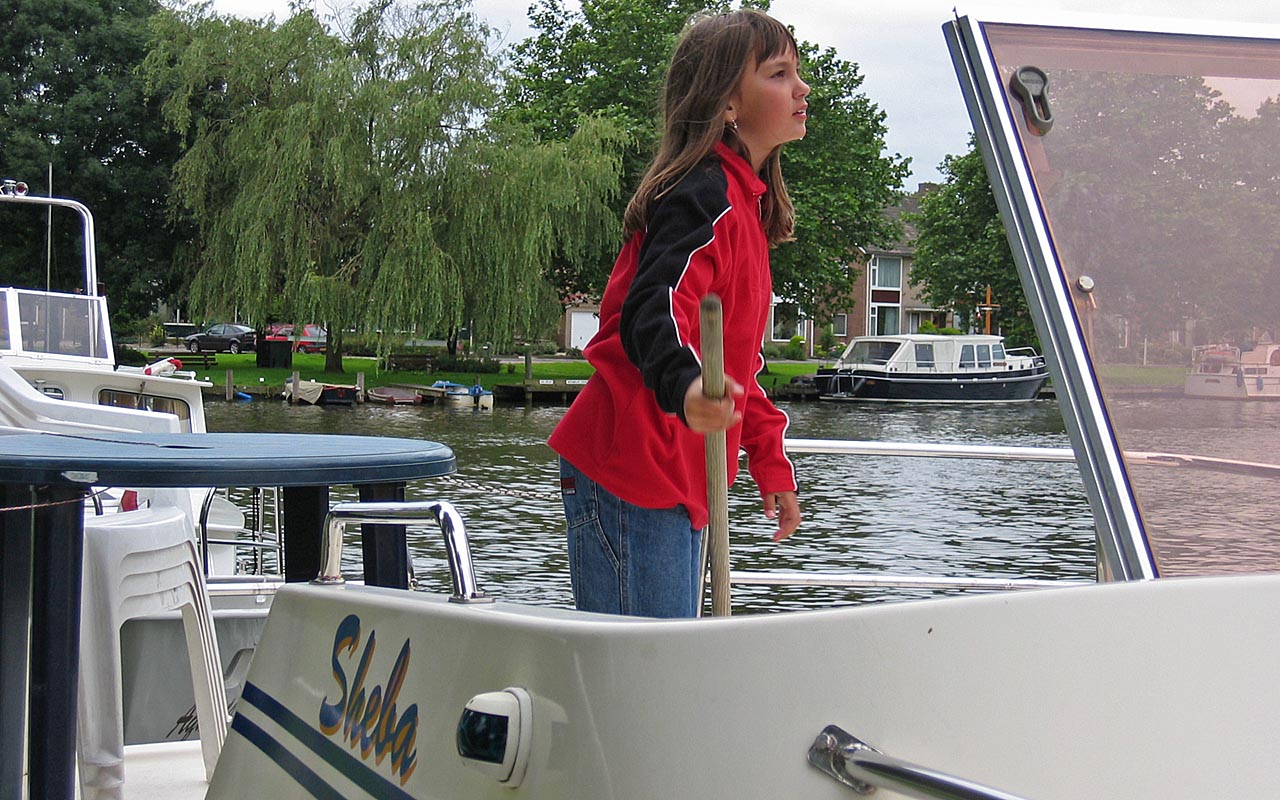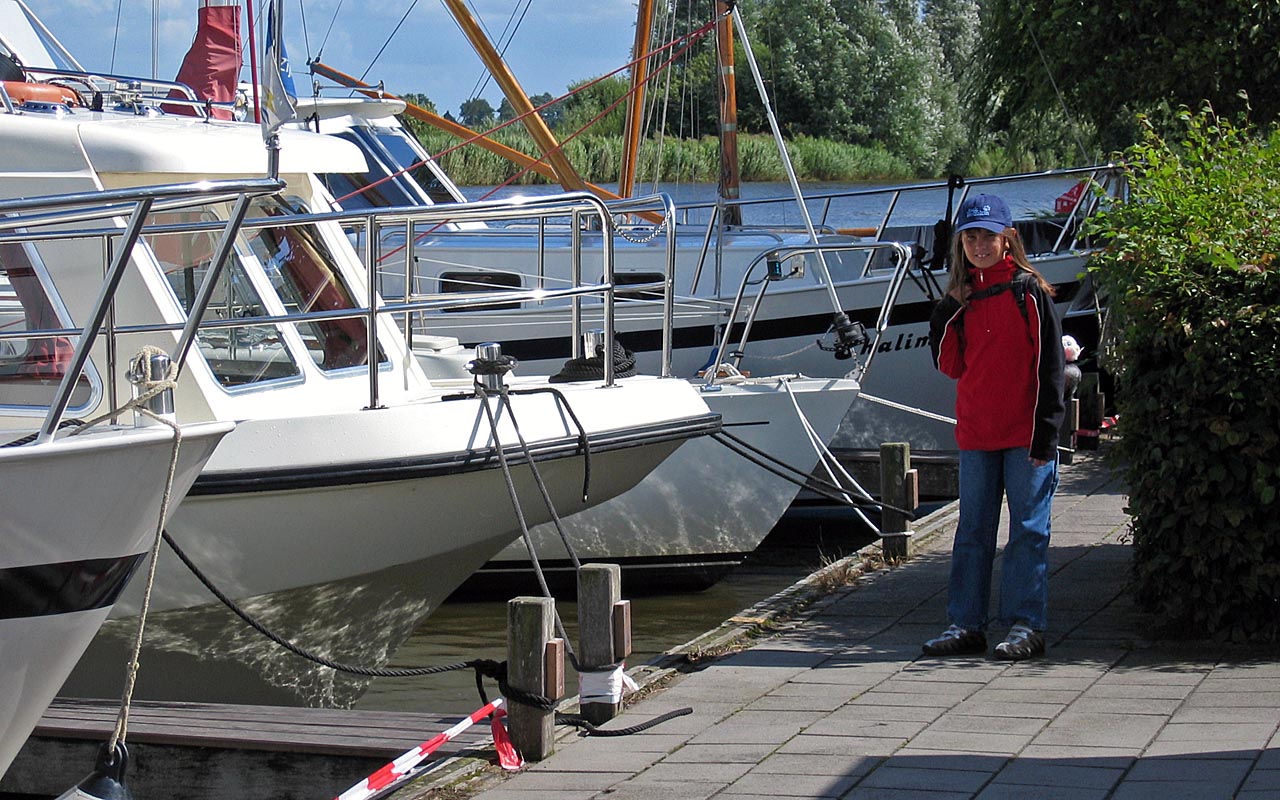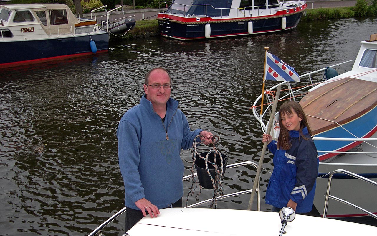 Unsere nächste Tagesetappe ging nach Joure. Also wieder “untenrum” von Sloten auf den Margriet-Kanaal und durchs Sneekermeer in den Noorder Oudeweg. Damit umgingen wir die damals unliebsamen und engen Brücken ums Langweerer Wielen und nahmen jeden Umweg in Kauf. Es ging durch die Joustersluis und in den Passantenhaven von Joure. Sowohl die offene Schleuse, als auch die Orts- und Hafeneinfahrt von Joure setzten alles an verfügbarem Adrenalin frei und bis wir uns zum Wasserplatz des Passentenhavens gehangelt hatten, wurde die Bugschraube einem Extrem-Test unterzogen, aber immerhin, sie schaltete nicht einmal ab! Gutes Teil! Der Hafenmeister von Joure war sehr freundlich und erkannte unseren Zustand auf Anhieb. Er gestattete uns, zwei Tage dort liegen zu bleiben und drückte der Sina sogar einen Euro für ein Eis in die Hand. So machten wir erstmal Ferien vom Fahrstress und verliebten uns ein wenig in das Städtchen, welches wir seitdem oft aufgesucht haben. Sina befasste sich intensiv mit der Knotenkunde, was ihr Jahre später in Friesland zugute kommen sollte. |