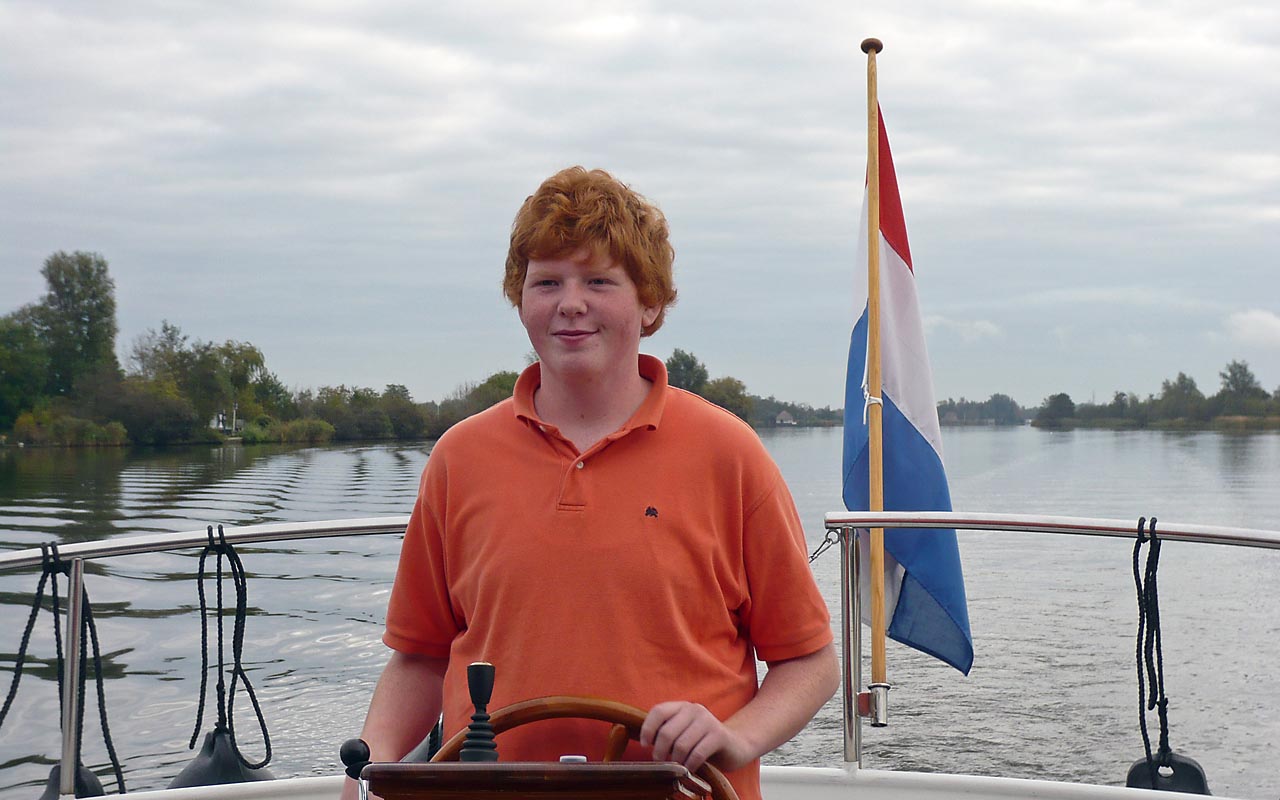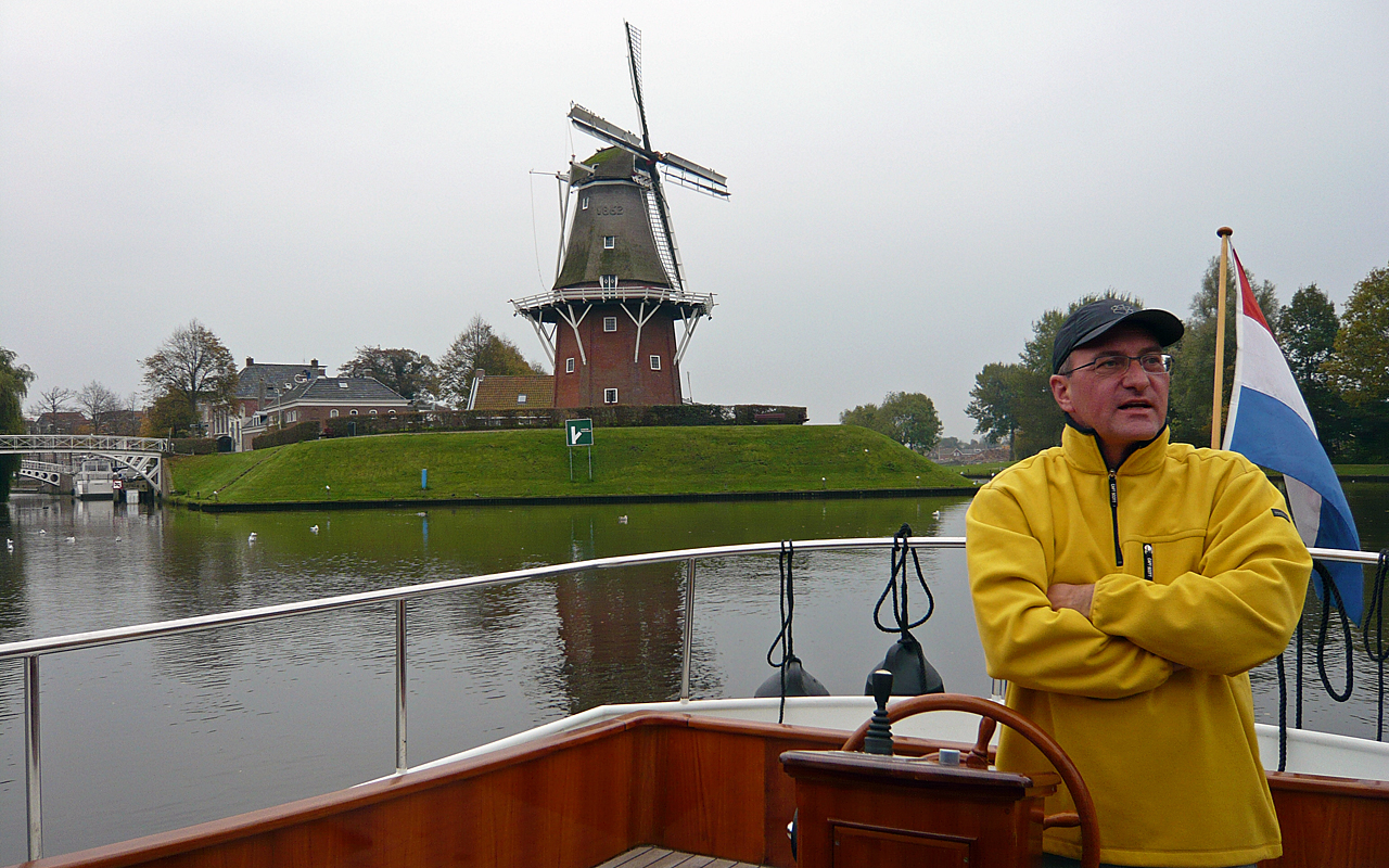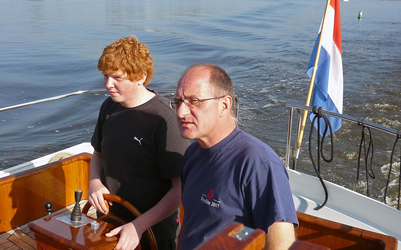 Der Sonntagmorgen war traumhaft schön, es erwartete uns ein herrlicher Sonnentag. Wir legten nach einem reichlichen Frühstück ab und fuhren über Sloten in Richtung Woudsend. Nachdem Eike sich schon am Samstag mit der Steuerung des Schiffs vertraut gemacht hatte, übernahm er heute schon maßgeblich das Ruder auf offenem Wasser.