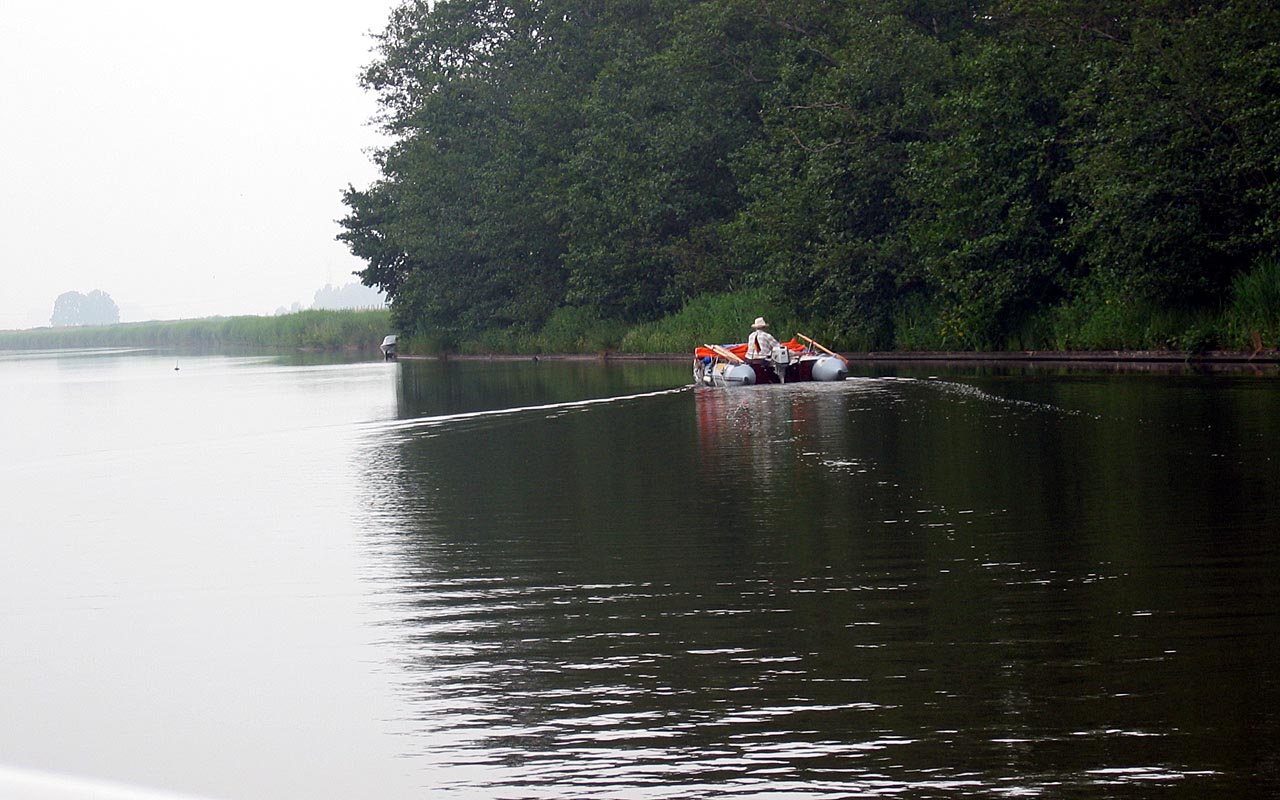 Der Montag präsentierte sich sonnig und heiß. Wir hatten bei dem herrlichen Wetter nicht einmal Lust auf ein ausgiebiges Frühstück, sondern fuhren zeitig los. Unser Weg führte uns von der Linde aus nach Ossenzijl, von dort durch die Kalenbergergracht, die Heuvengracht in Richtung Giethoornsemeer. Einen besonders schönen Anblick bietet die Durchfahrt der Kalenbergergracht mit den “Zwergenhäuschen” und deren gepflegten Gärten. In Richtung Beuklaker Wijde fahrend beschlossen wir, von der Südroute abzuweichen und nach Giethoorn, dem Venedig der Niederlande zu fahren. Der Weg ist das Ziel und an diesem herrlichen Tag war an Anhalten nicht zu denken. Also tuckerten wir nach Steenwijk weiter, wo wir um 15.00 Uhr im Passantenhaven festmachten. Wir frischten in der Stadt unsere Vorräte auf, hatten aber dann keine Lust, zwischen den Häusern im Hafen zu übernachten. Wir dachten an den schönen, warmen Vorabend an der Linde und steuerten durch den Kanaal Steenwijk - Ossenzijl das gestrige Ziel noch einmal an, nachdem wir an der Hafeneinfahrt von Steenwijk Frischwasser aufgefüllt hatten. Während des ganzen Tages fiel uns auf, daß die Brücken automatisch bedient werden und das Bruggeld entfällt. Wir kamen um 18.00 Uhr wieder dort an, wo wir am Morgen losgefahren waren. Allerdings vergassen wir im Eifer des heissen Gefechts, den Mast vor der letzten Brücke zu legen und das sollte uns die ersten 200,- Euro Kaution kosten, denn die Beleuchtung war hinüber. So verabredeten wir uns für den nächsten Tag in Joure mit Sytze Kooi, der den Mast zum Richten abholen wollte.