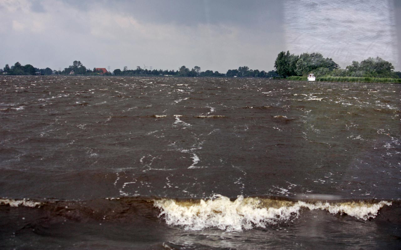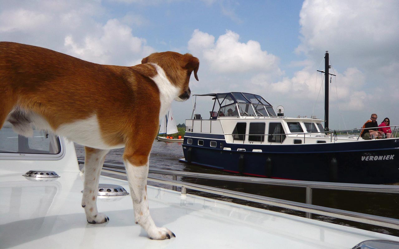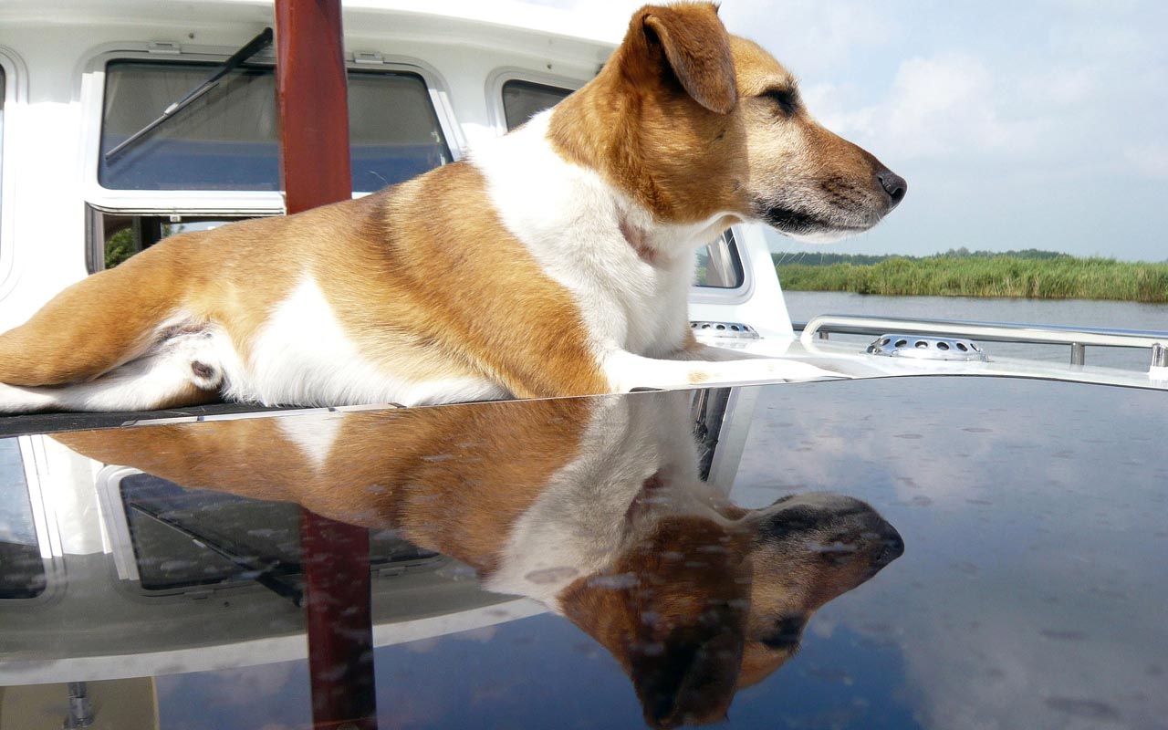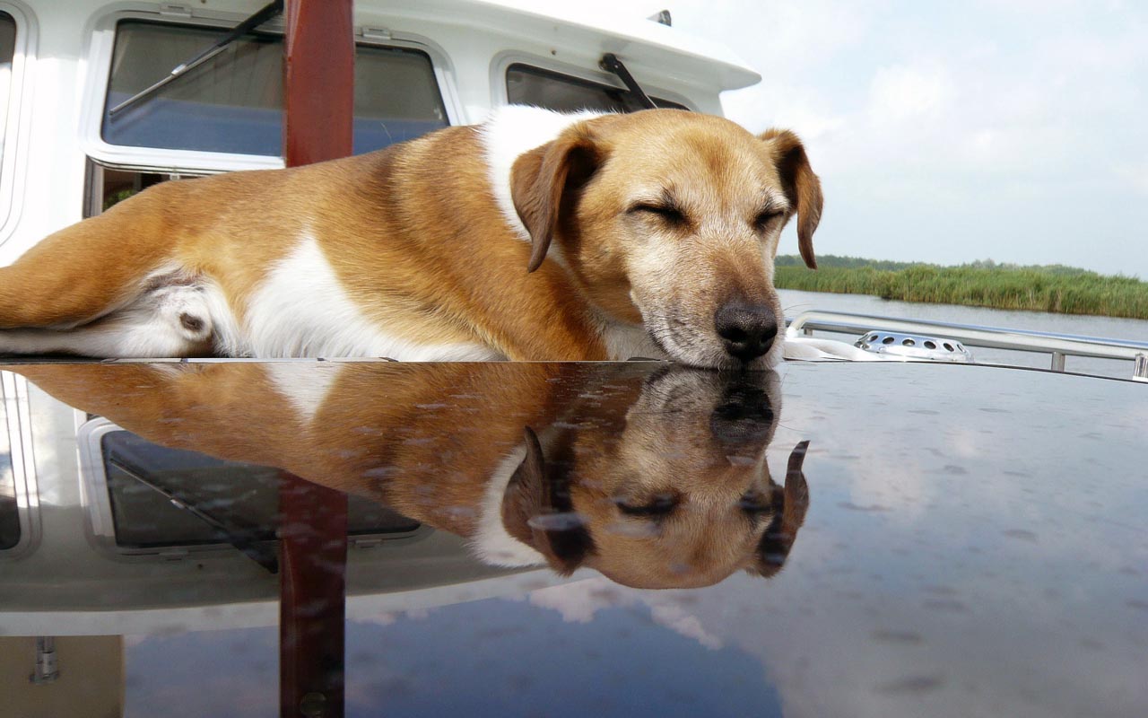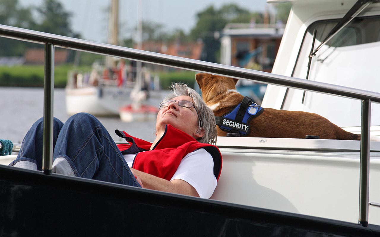 Unser Chuck ist absolut bootstauglich. Bei Windstärke 5 kuschelt er sich gerade mal an. Allerdings hat er seinem Titel “Sercurity”-Hondje alle Ehre gemacht. In der Pizzeria von Woudsend und der Oranjerei von Joure hat er sich vorzüglich benommen.